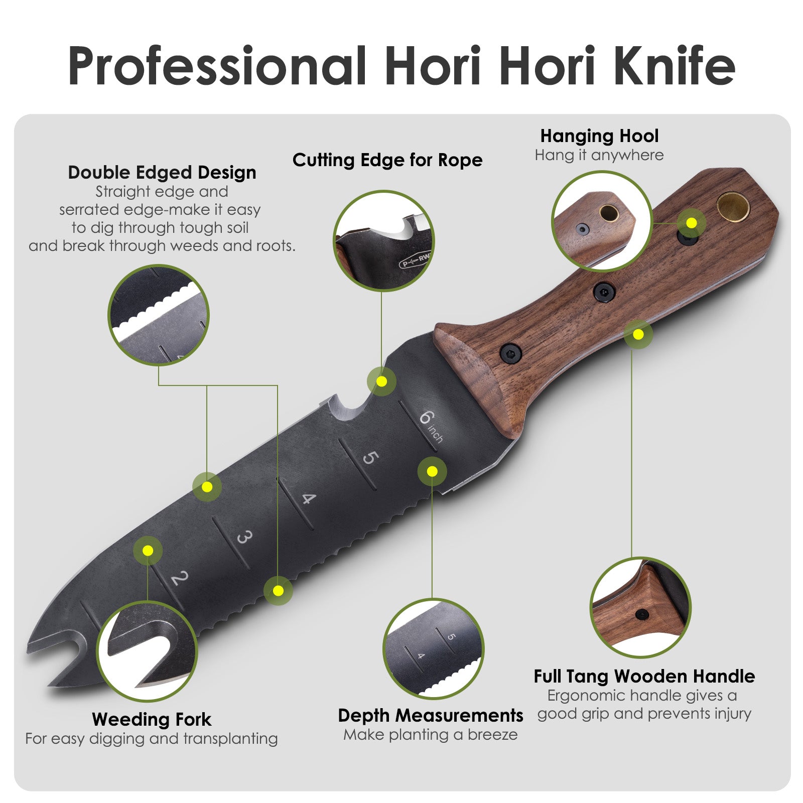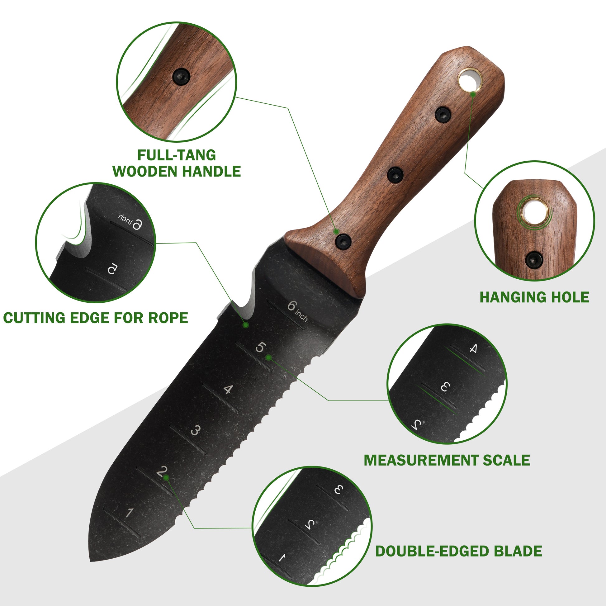 Multifunction Blade:Features a sharp edge for slicing and a serrated edge for cutting tough roots. The curved blade and depth measurement in inches make planting a breeze. The cord-cutting edge also acts as a bottle opener. With so many uses, this knife is a good pick for a range of outdoor activities, including gardening, fishing, and camping.