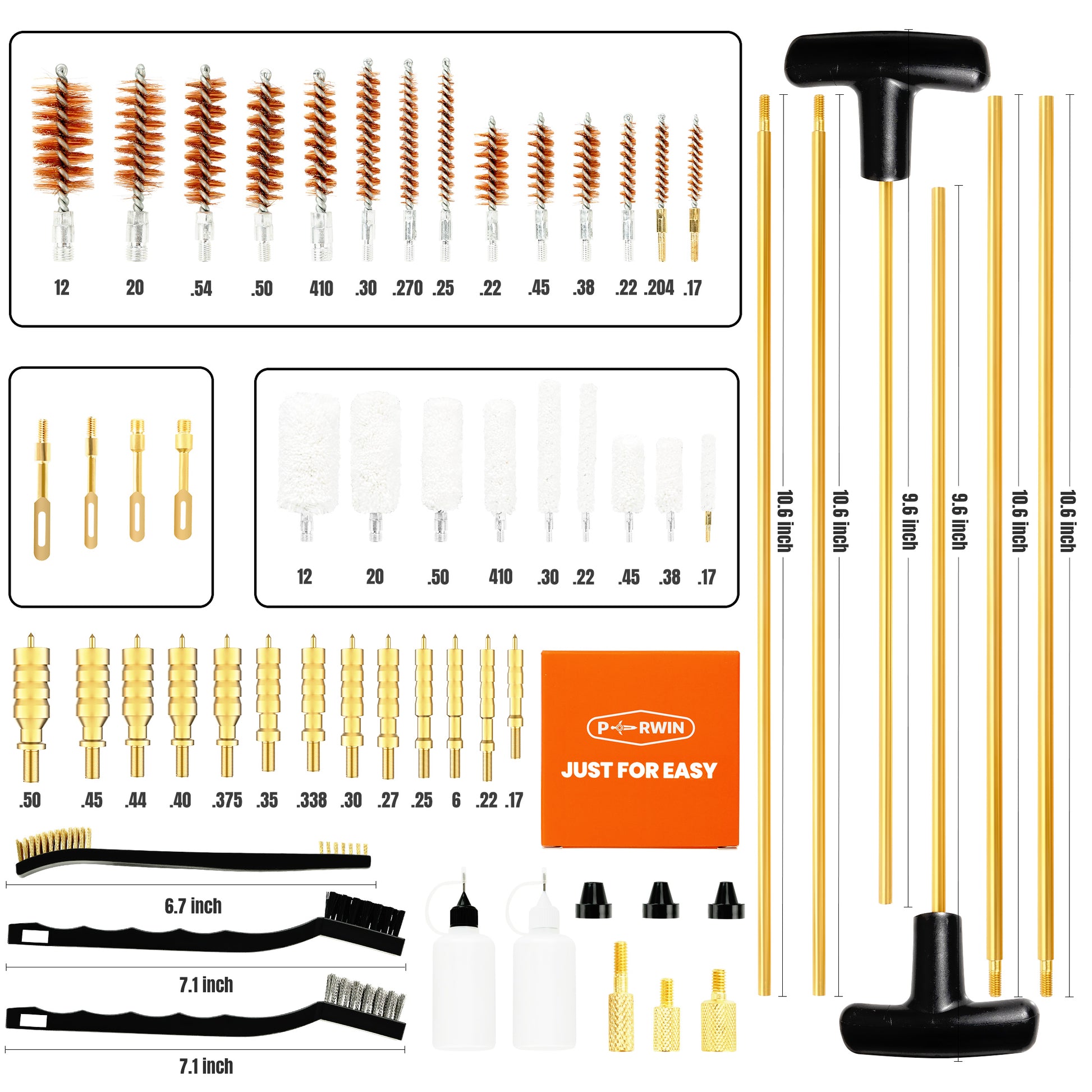 【WHAT YOU GET】This universal cleaning kit includes 6 solid brass rods; 3 utility brushes; 14 brushes; 9 cleaning mops; 12 brass spear-pointed jags; 1 powder jag; 4 slotted patch loops; 3 muzzle guards; 3 accessory adapters; 30pcs 3×3" cleaning patches;